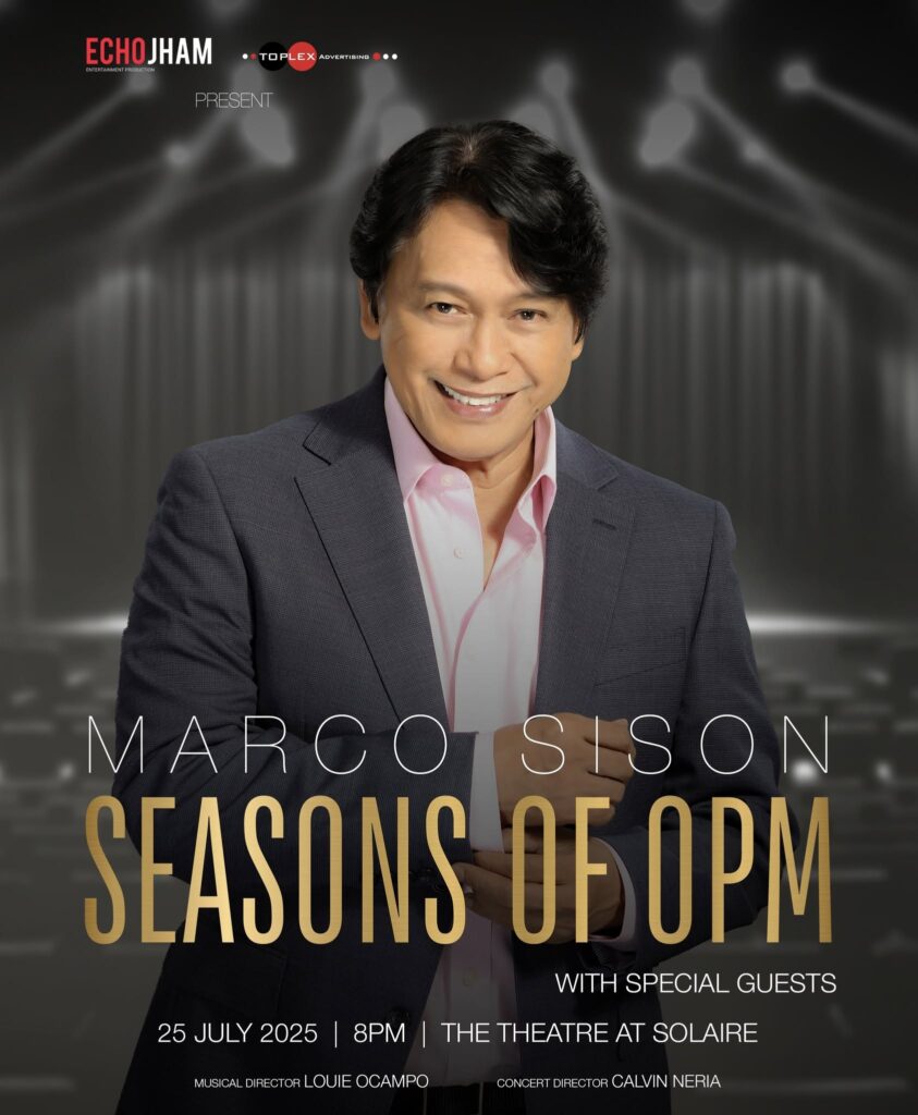 Produced by Echo Jham Entertainment in collaboration with Toplex Advertising, ‘Seasons of OPM’ is a musical journey through time and is envisioned as a sweeping retrospective of the rich tapestry that is Original Pilipino Music. From the tender strains of traditional kundiman to the powerful ballads and iconic anthems of the ‘70s, ‘80s, and ‘90s, Marco Sison will guide audiences through a sonic timeline that mirrors the evolution of a nation’s heart and soul.