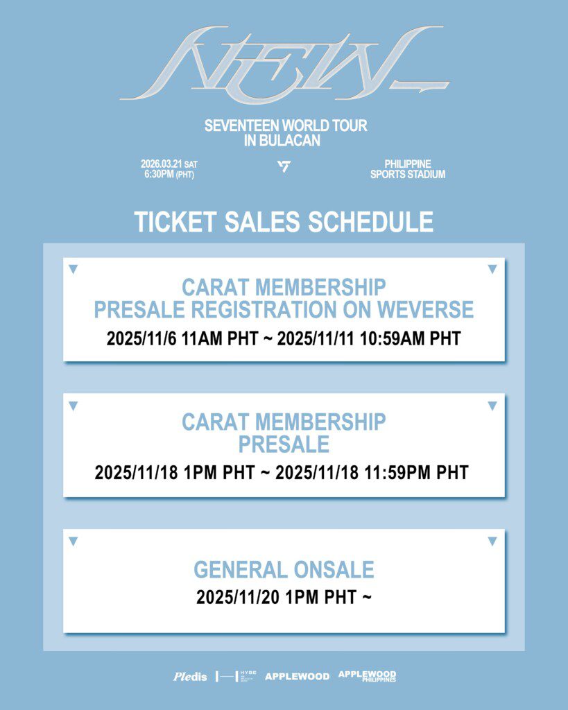 CARAT MEMBERSHIP holders on Weverse can register for the presale from November 6, 2025, 11:00 AM (PHT) to November 11, 2025, 10:59 AM (PHT). The CARAT MEMBERSHIP Presale will be held on November 18, 2025, from 1:00 PM to 11:59 PM (PHT), followed by the General Onsale on November 20, 2025, at 1:00 PM (PHT). Each CARAT membership account may purchase up to four (4) tickets.