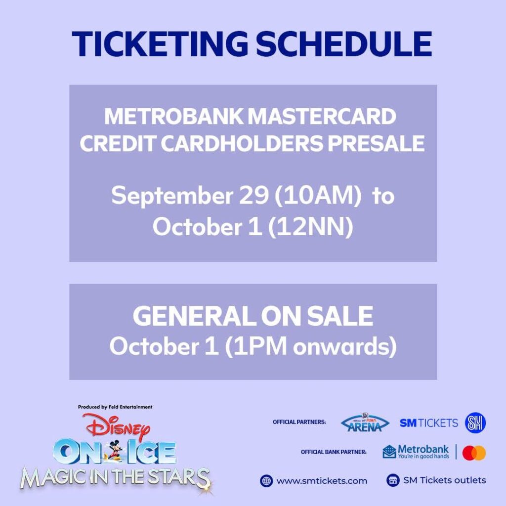 Metrobank Mastercard credit cardholders will enjoy exclusive first access to Disney On Ice tickets with a special pre-sale running from September 29, 10:00 AM until October 1, 12:00 NN. This early access gives cardholders the chance to secure the best seats for the show. Tickets will be available to the general public starting October 1, 2025 at 1:00 PM.