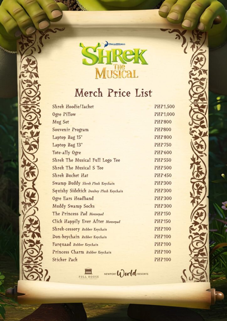 Among the smaller souvenirs are rubber keychains, including the Shrek-cessory, Don-keychain, Farquaad, and Princess Charm, each priced at PHP 100, offering collectible keepsakes that add a dash of personality to any bag or keyring. Another collector’s gem is the Souvenir Program at PHP 800, packed with the show’s highlights, cast features, and behind-the-scenes details.