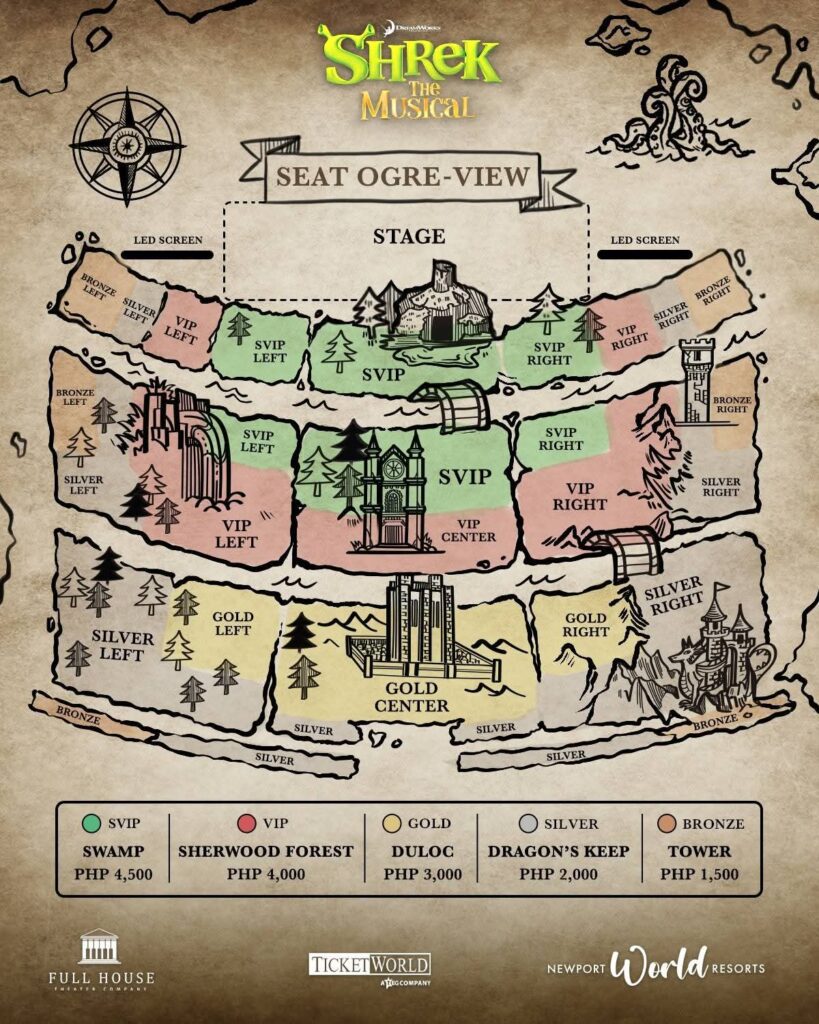 Witness the ogre-sized production of Shrek The Musical until December 2025 at the Newport Performing Arts Theater. Tickets are available at Ticketworld and Newport World Resorts Box Office: PHP 4,500 (SVIP), PHP 4,000 (VIP), PHP 3,000 (GOLD), PHP 2,000 (SILVER), and PHP 1,500 (BRONZE). For inquiries, contact Customer Care at 7908-8888 or info@fhtcentertainment.com.
