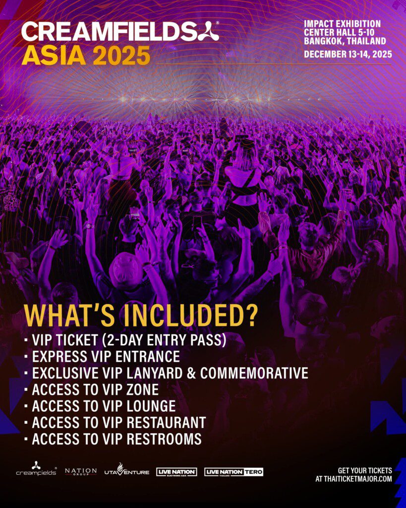 “Creamfields has a decade of experience in Asia, and we believe now is the perfect time to unite Creamfields fans from across the continent for one massive celebration. There’s no better place than Thailand to host this event. We are committed to delivering one of the biggest lineups ever in Asia, paired with an immersive indoor production experience for fans throughout the region. With our extensive experience, we are confident in creating a truly unforgettable indoor event. Our partnership with Live Nation and the UTA Group gives us the best opportunity to succeed, and we look forward to expanding the event further with them in Thailand.”