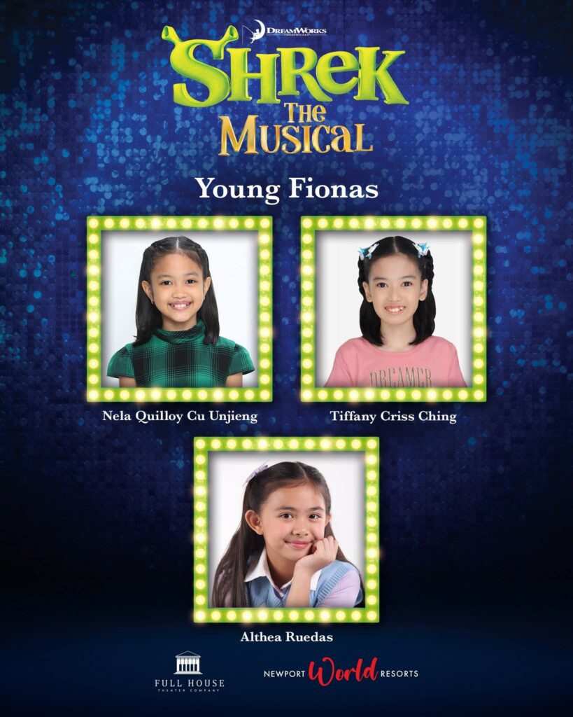 Selected to alternate as Young Fiona are Nela Quilloy Cu Unjieng, Tiffany Criss Ching, and Althea Ruedas. Cu Unjieng has performed in various youth theater productions, including Godspell and Joseph and the Amazing Technicolor Dreamcoat. Ching, a homeschooled student, brings solo vocal experience and stage confidence. Ruedas, the eldest among the trio, has a background in both film and television, with appearances in local and international screen projects.